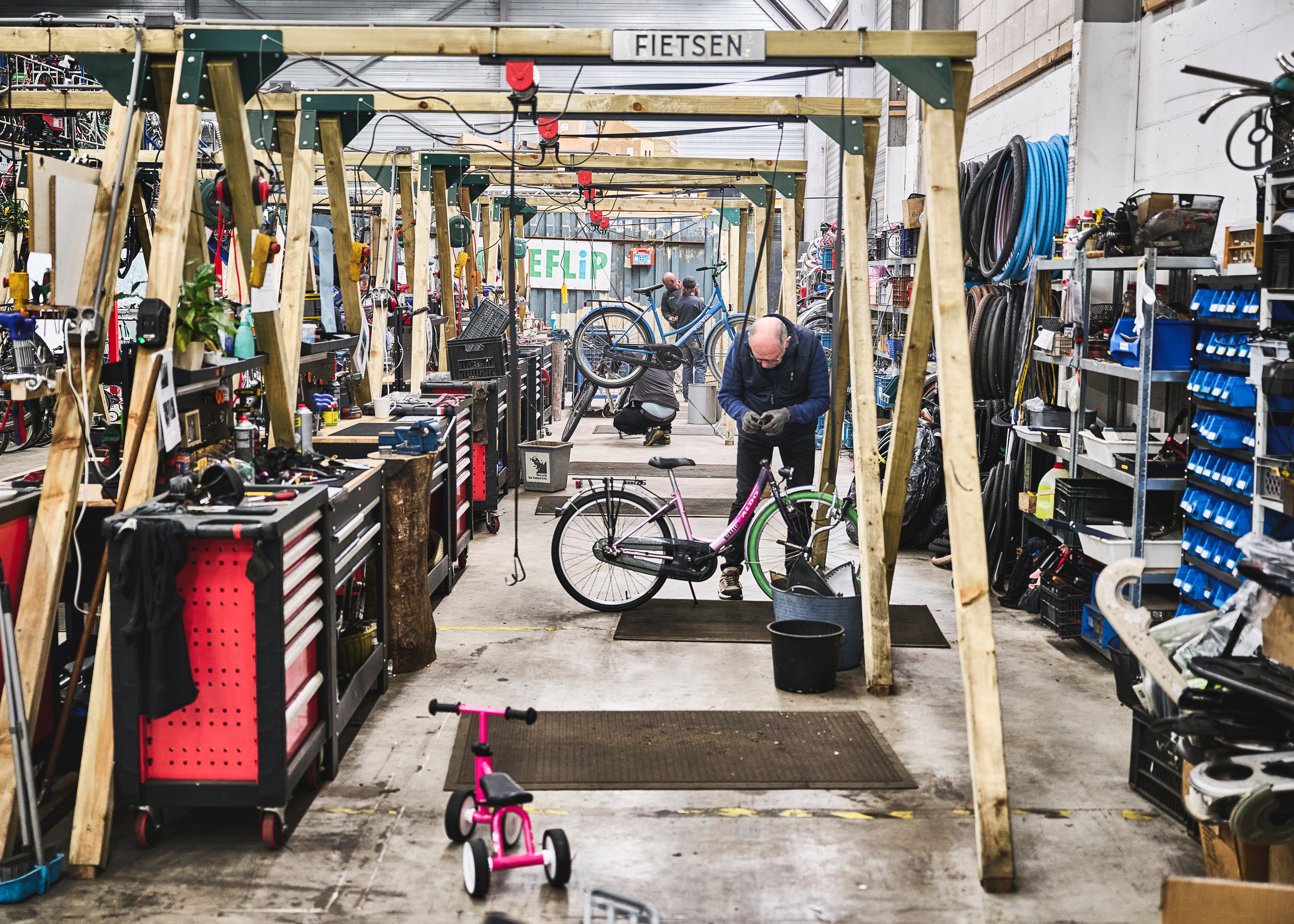 BikeFlip combines circular children’s bicycles with job opportunities for people on the margins of the labour market. In the new, larger workshop there is space for structure, rhythm and growth. Participants refurbish bikes, each at their own station and pace. With support of Anton Jurgens Fonds, BikeFlip developed a light impact measurement tool focusing on self-confidence, wellbeing, and social skills. In 2024, several participants successfully transitioned to other jobs or further education. The organisation continues to grow and gradually opens more workshops: more people at work, and more children on better bikes.